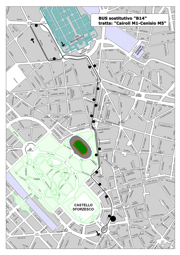 - Bus B14 tra Cairoli, Lanza, Baiamonti, Monumentale e Cenisio (mappa del percorso). I bus partono dalla fermata del bus 57 in Foro Buonaparte (Cairoli). Fermano a Lanza, viale Gadio, via Legnano, piazza Lega Lombarda, viale Montello, piazzale Baiamonti, via Ceresio (corsia centrale), via Procaccini e via Cenisio. Da qui ripartono al contrario per Cairoli.